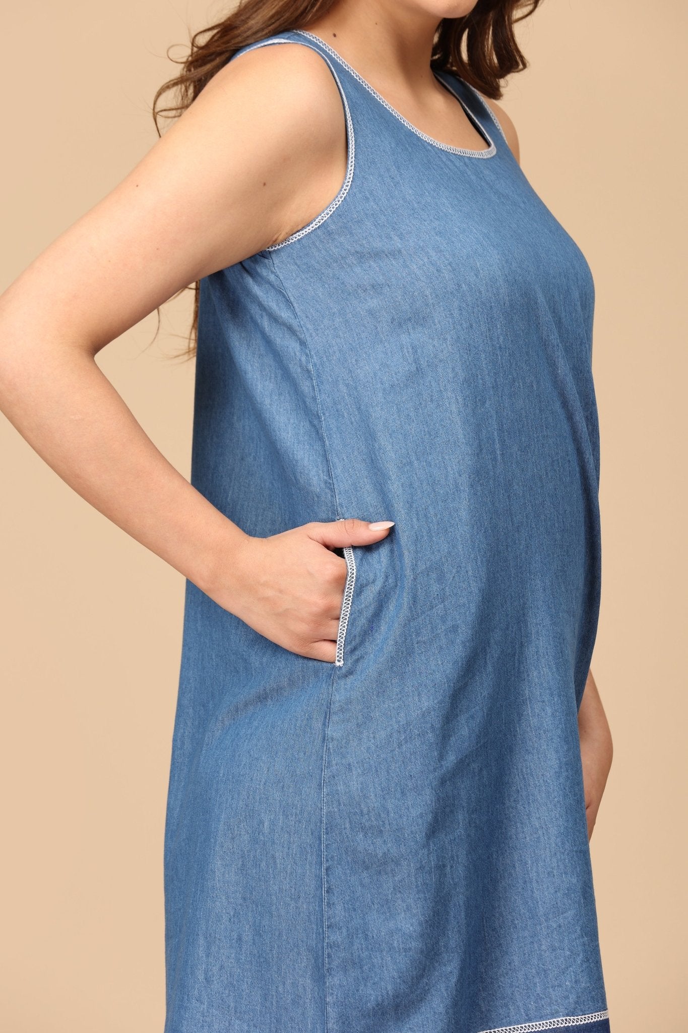 Step into effortless style with this breezy denim chambray dress, designed in playful two-tone colour blocks. The subtle highlighted embroidery along the seams adds a touch of artisanal charm while keeping it minimal and chic.