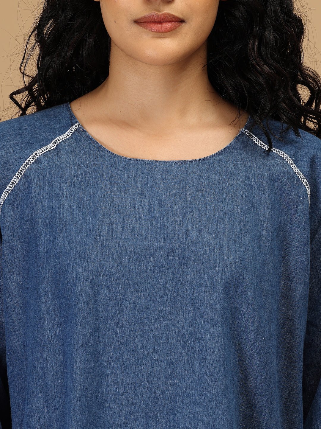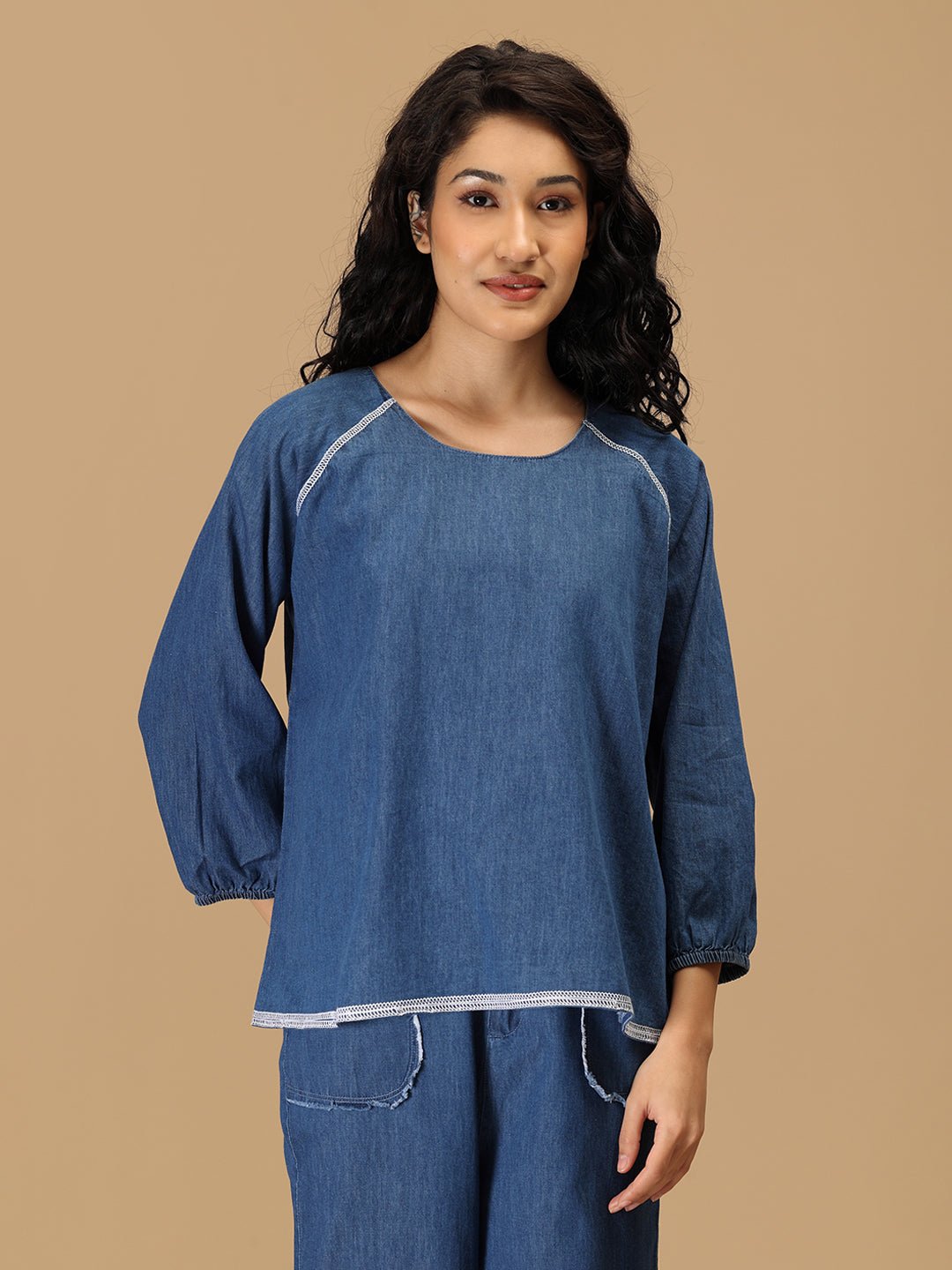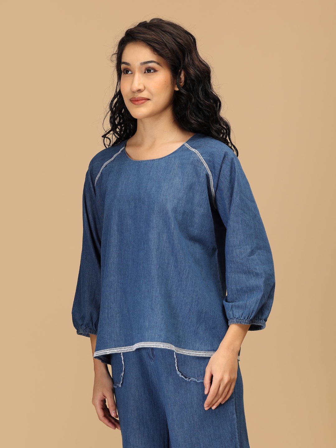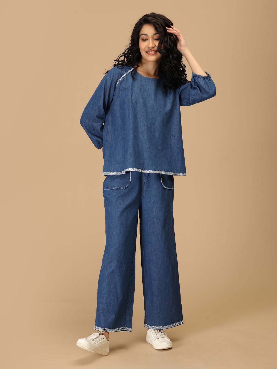 Effortlessly stylish and endlessly comfortable, the Downtown Chambray Co-ord Set brings modern ease to everyday dressing. Made from lightweight chambray denim, it features a relaxed round-neck top with 3/4 gathered sleeves and wide-leg pants with contrast-trim pockets. Perfect for travel, casual outings, or laid-back weekends, this set blends comfort, movement, and chic minimalism in one easy look.