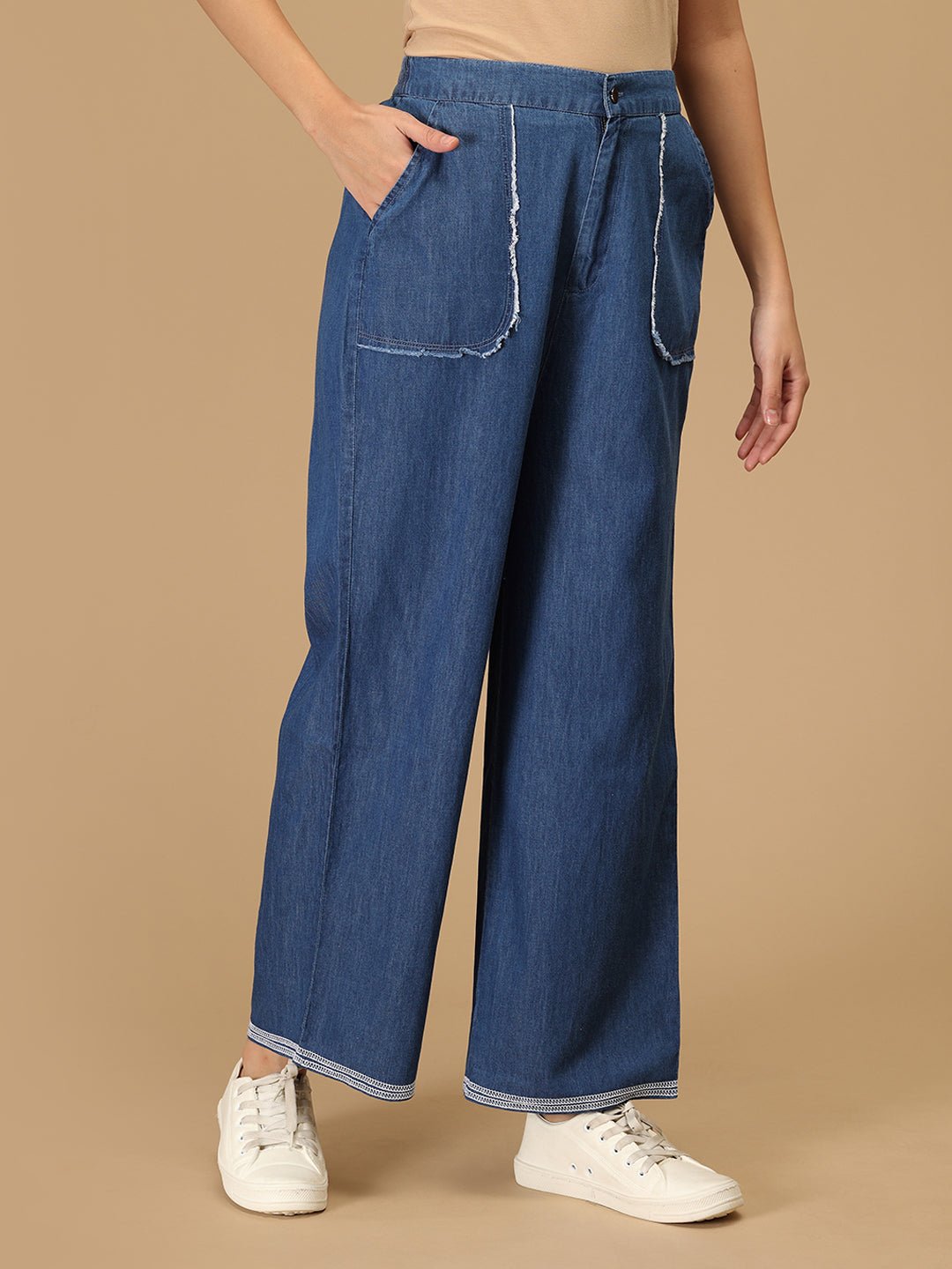 Pants Design: Wide-leg pants with contrast-trim curved pockets